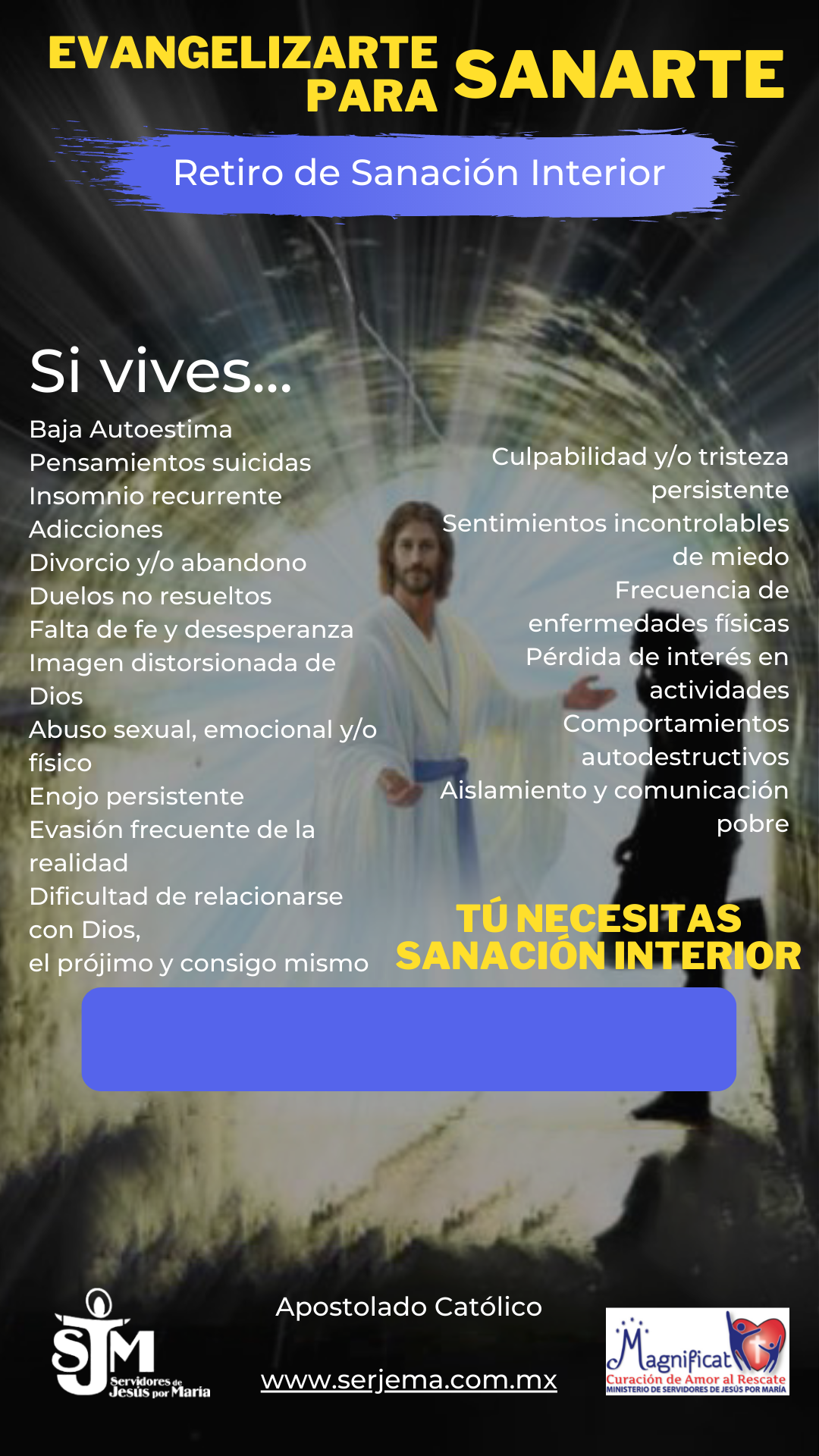 Promueve el encuentro personal con Cristo Jesús EVANGELIZARTE PARA SANARTE Sanación Interior. A través de la conversión para una nueva vida de oración con el corazón, el Rosario, confesión frecuente, participación y adoración de la Eucaristía, lectura y meditación de la Palabra de Dios.